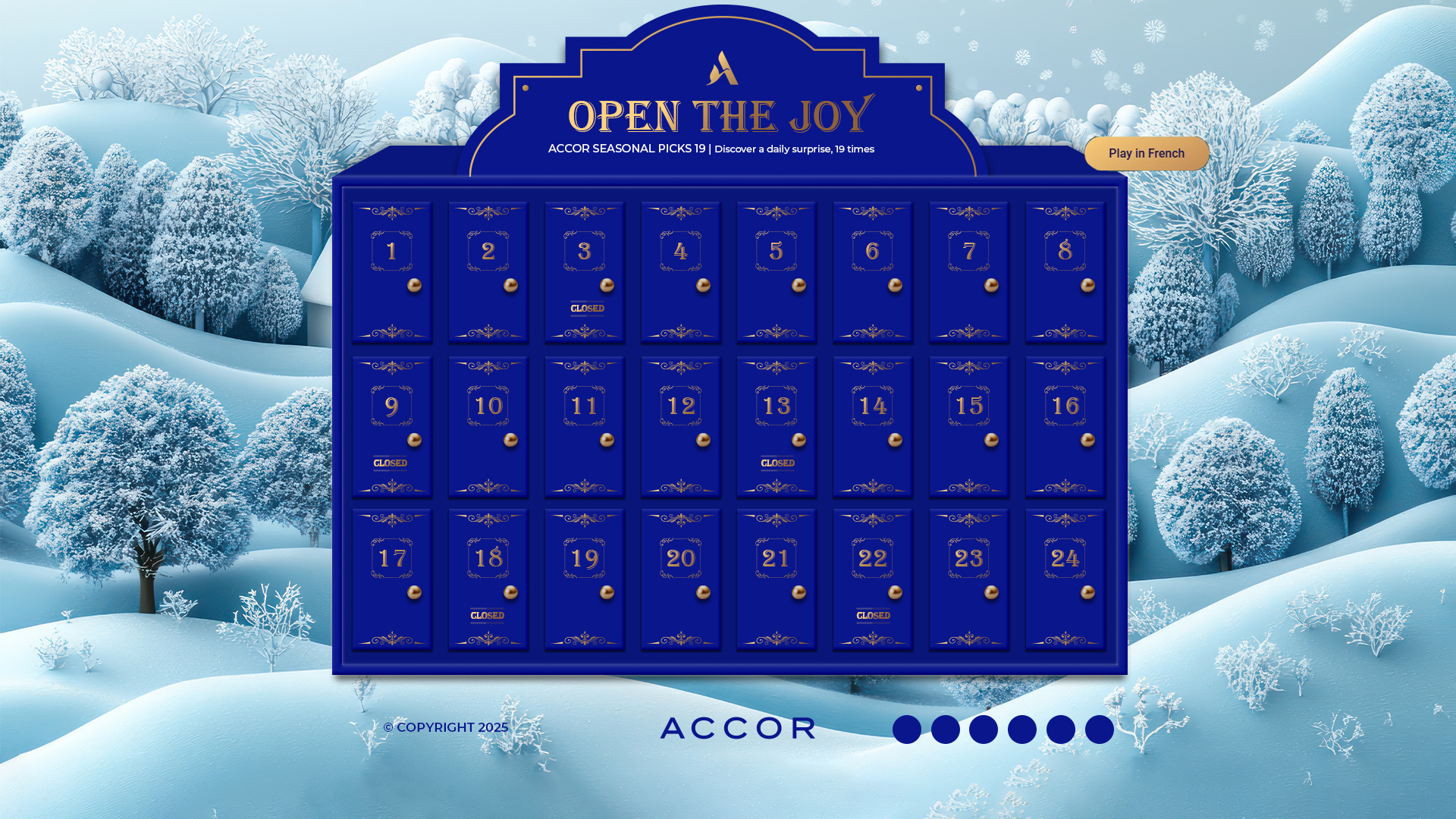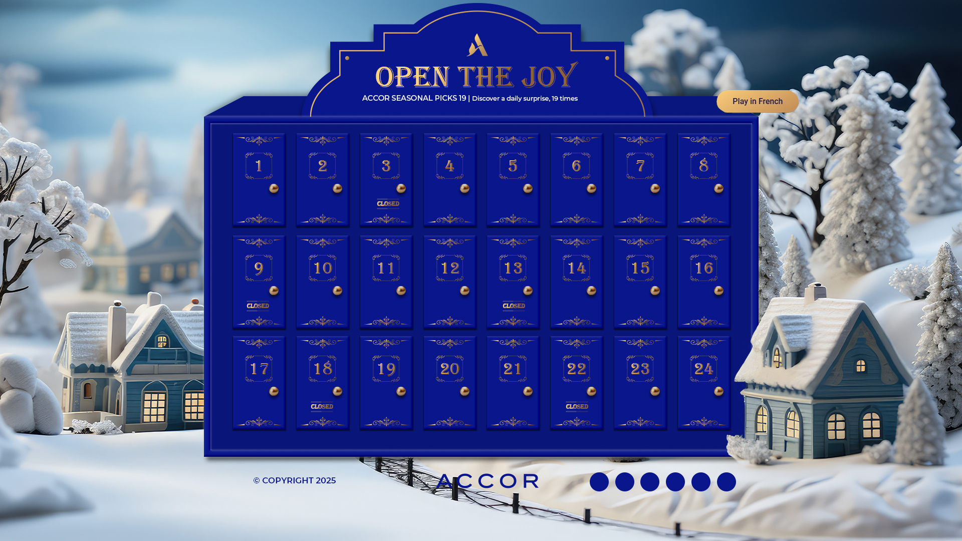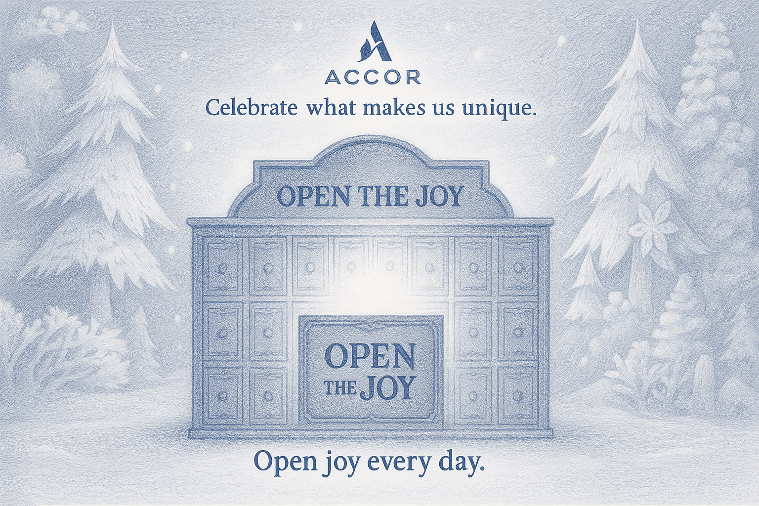Cada puerta de Open e Joy muestra el interior de una caja con un mensaje breve y positivo. Hemos elegido 19 temas inspirados en los valores y gestos de la marca: piezas cortas, universales y fáciles de localizar. La composición mantiene el estilo editorial del visual (luz cálida dentro, azul Accor fuera).