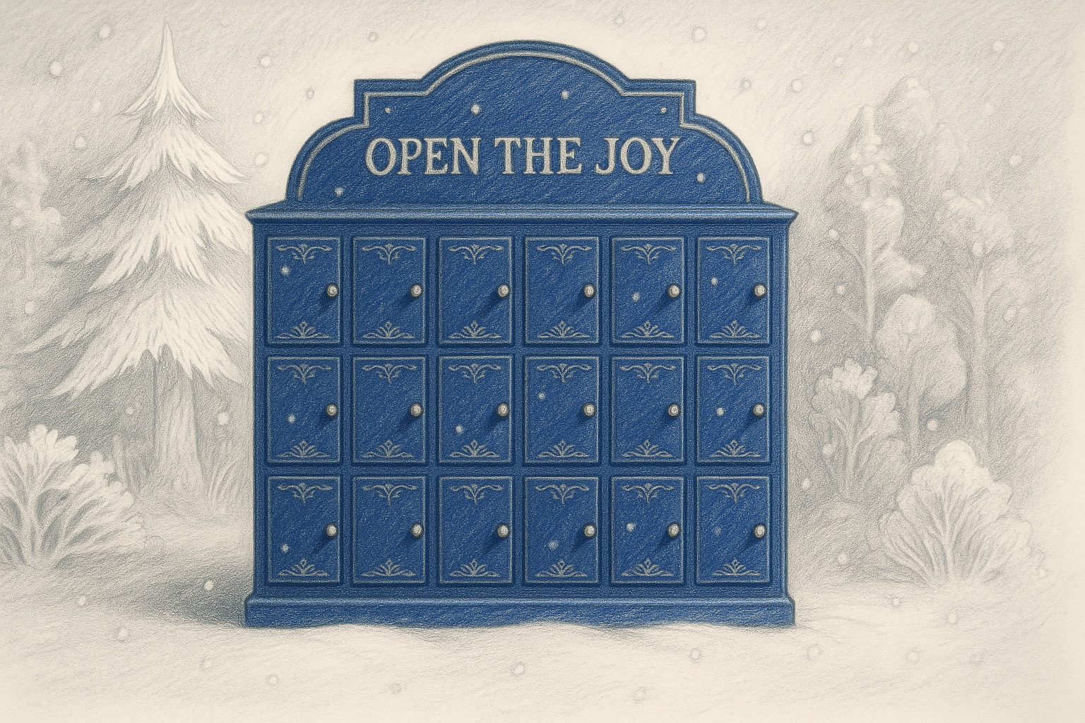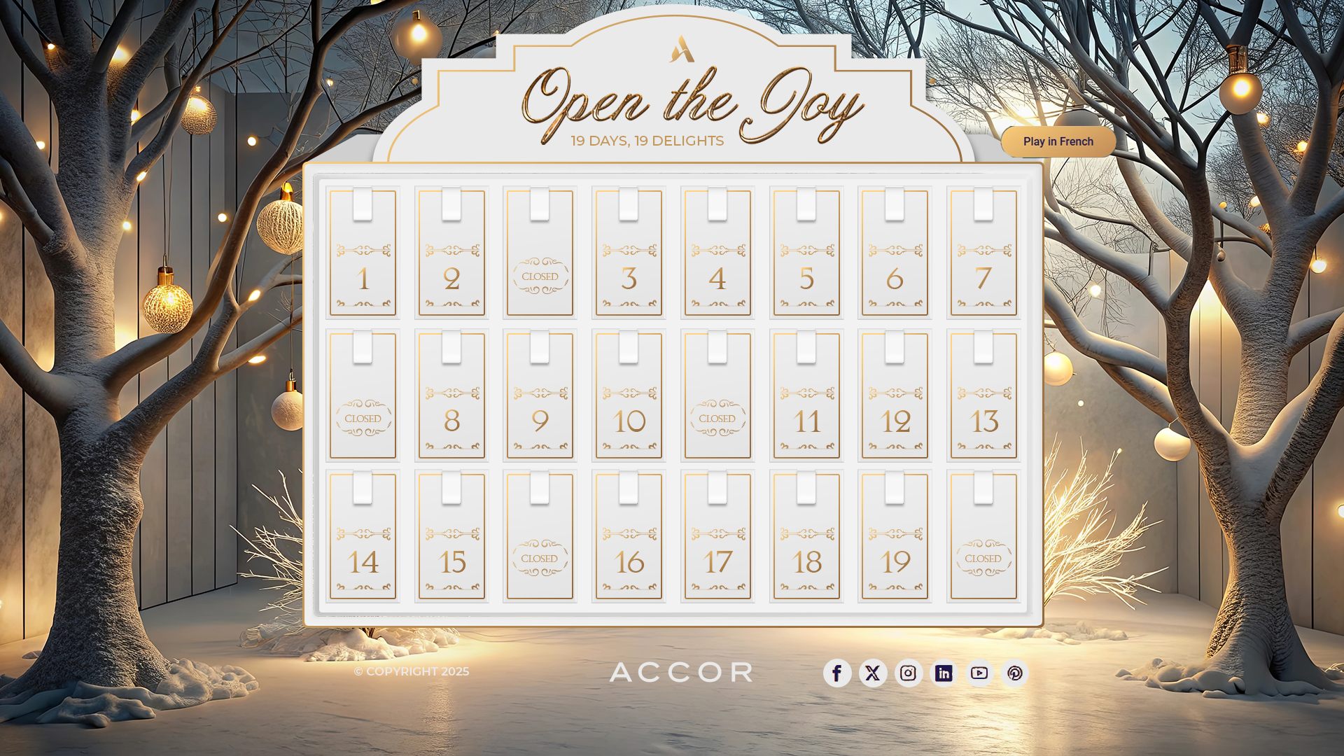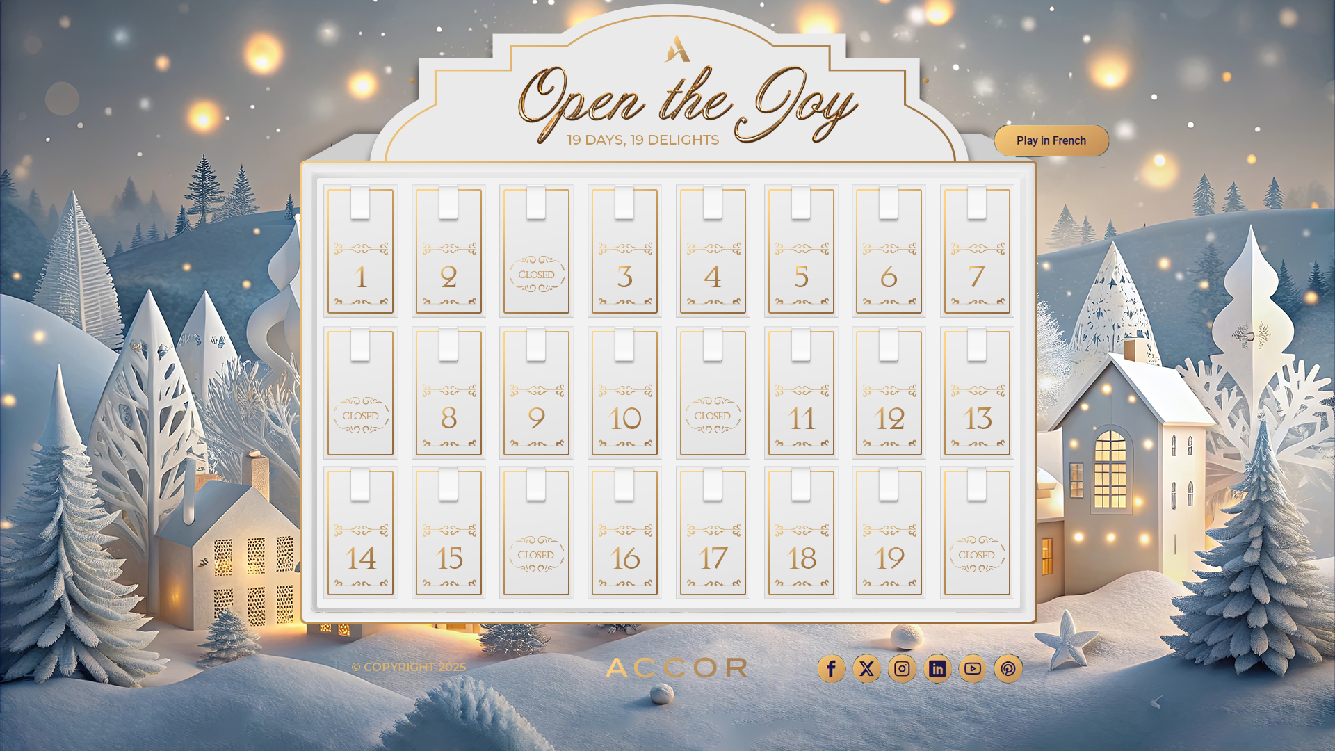 Cada puerta de Open e Joy muestra el interior de una caja con un mensaje breve y positivo. Hemos elegido 19 temas inspirados en los valores y gestos de la marca: piezas cortas, universales y fáciles de localizar. La composición mantiene el estilo editorial del visual (luz cálida dentro, azul Accor fuera).