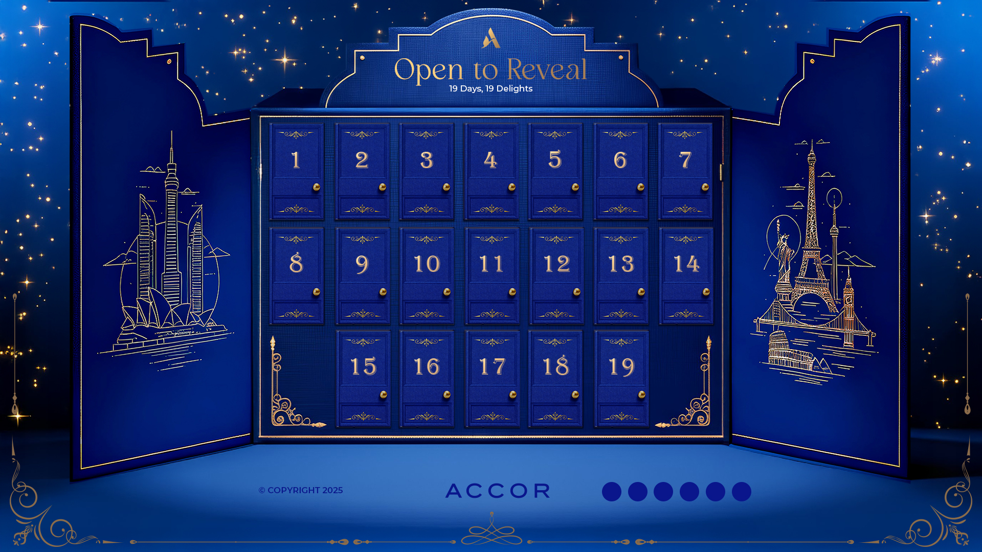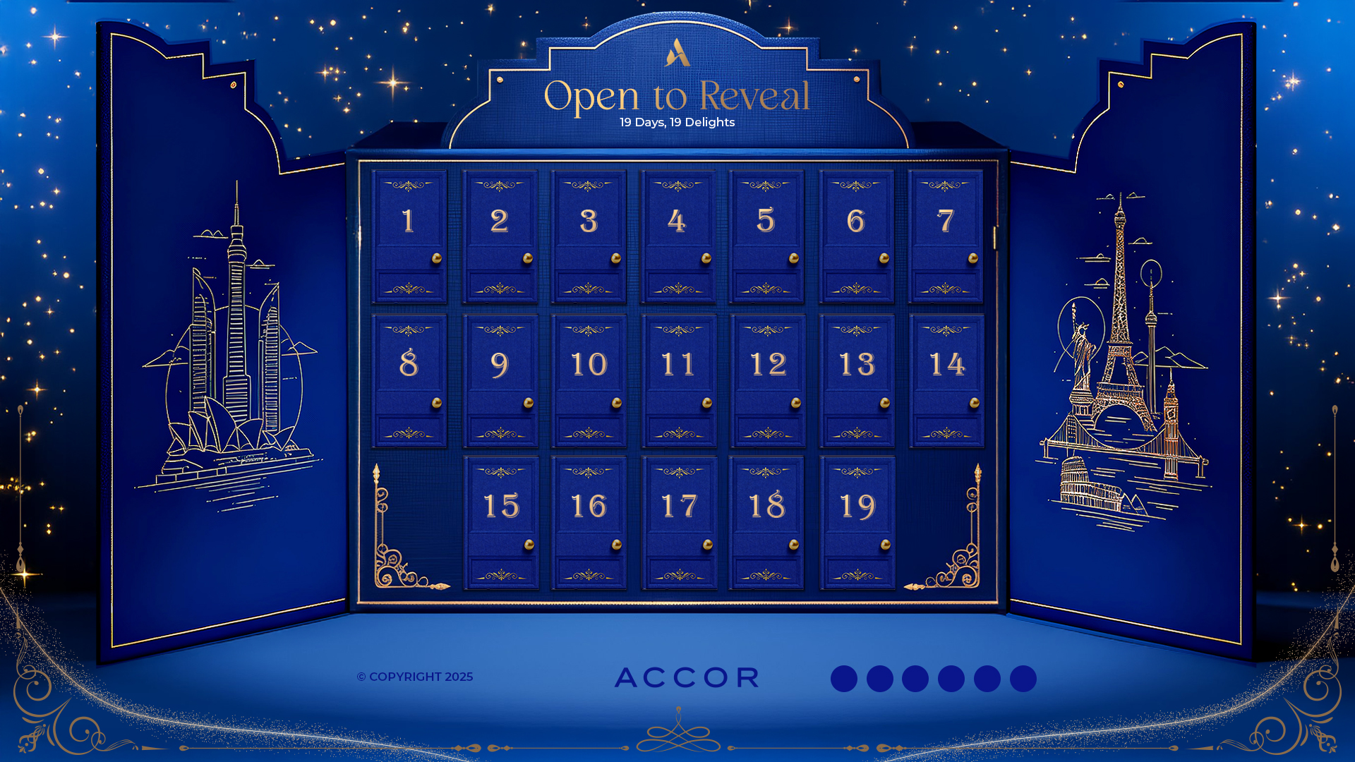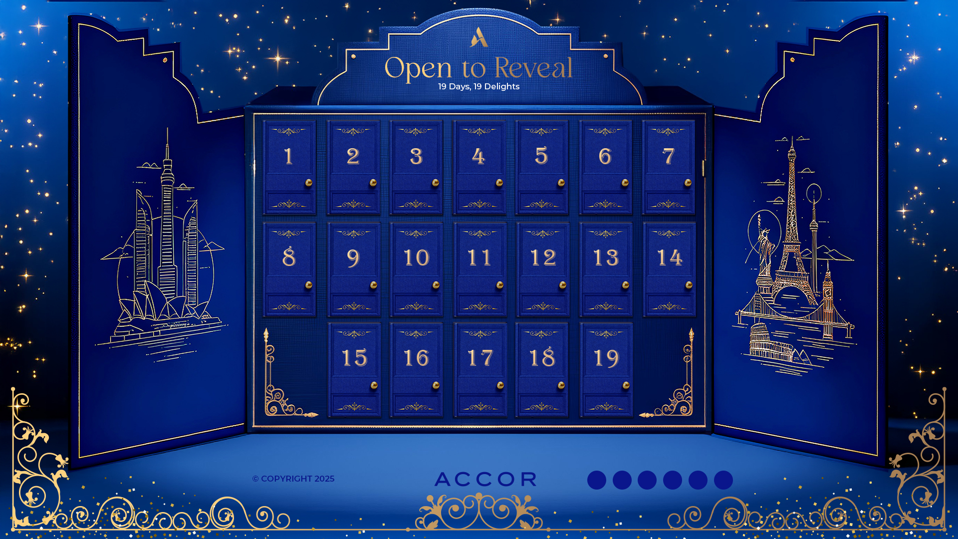 La propuesta combina azul noche Accor y dorado champán con un halo de confeti que enmarca el área de juego. Las cajitas aportan volumen y relieve y, al abrirse, revelan un interior dorado donde se coloca el mensaje en azul oscuropara una lectura clara y elegante. Sutiles efectos de iluminación subrayan el instante de apertura sin estridencias, mientras los filetes decorativos y la numeración refinan el conjunto.