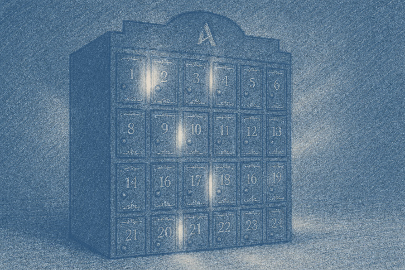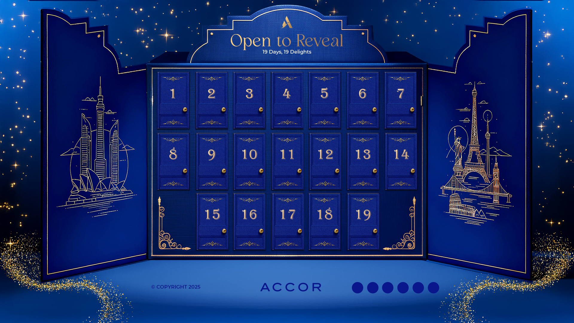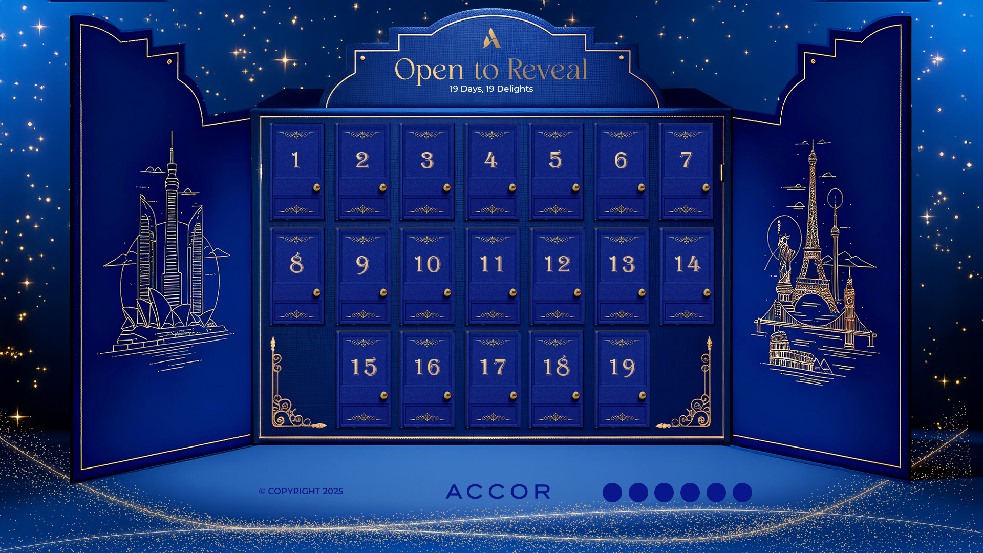 La propuesta combina azul noche Accor y dorado champán con un halo de confeti que enmarca el área de juego. Las cajitas aportan volumen y relieve y, al abrirse, revelan un interior dorado donde se coloca el mensaje en azul oscuropara una lectura clara y elegante. Sutiles efectos de iluminación subrayan el instante de apertura sin estridencias, mientras los filetes decorativos y la numeración refinan el conjunto.