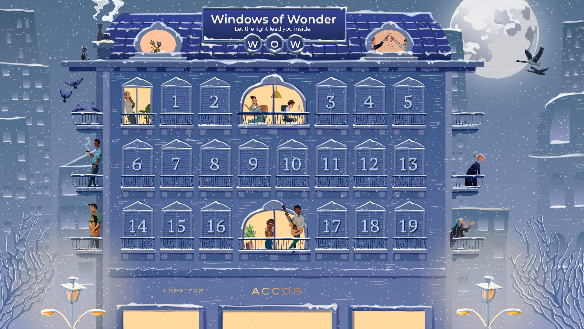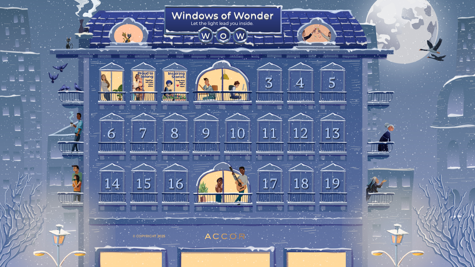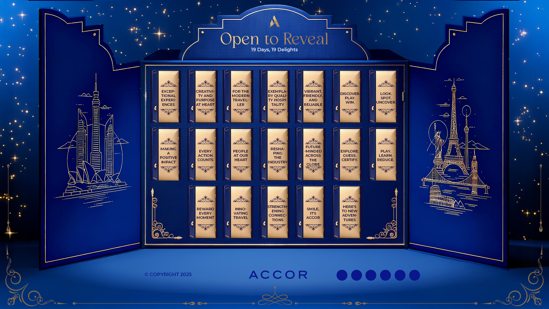 En Windows of Wonder cada apertura muestra el interior de una habitación iluminada con un mensaje breve y positivo. Hemos elegido 19 temas inspirados en los valores y gestos de la marca: piezas cortas, universales y fáciles de localizar. La composición mantiene el estilo editorial del visual (luz cálida dentro, azul Accor fuera).