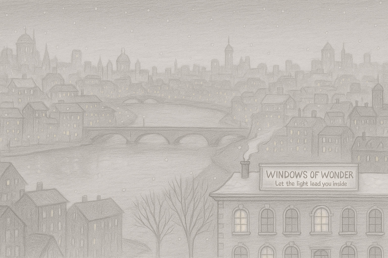 Plano muy general de ciudad invernal de noche: río con puentes, capas de edificios en profundidad, nevada suave. En el borde inferior derecho asoma discreto el tejado del hotel WoW con humo de la chimenea.