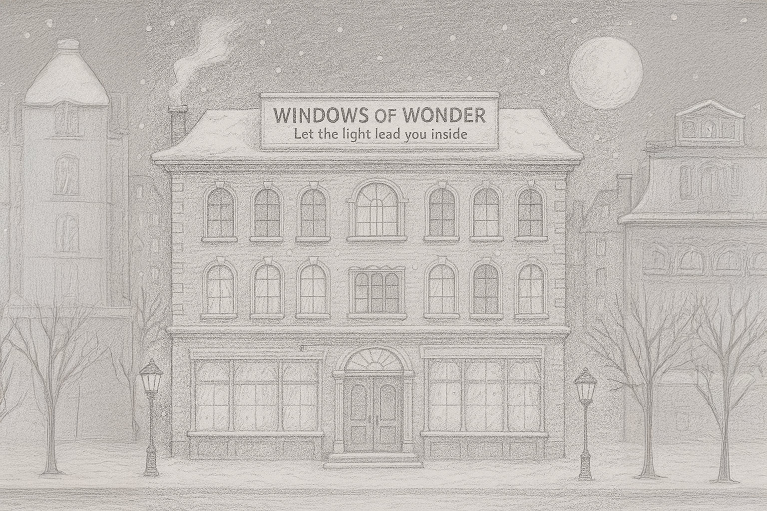 Fachada frontal del hotel con rótulo WINDOWS OF WONDER y tagline Let the light lead you inside. Ventanas apagadas, luna y nieve.