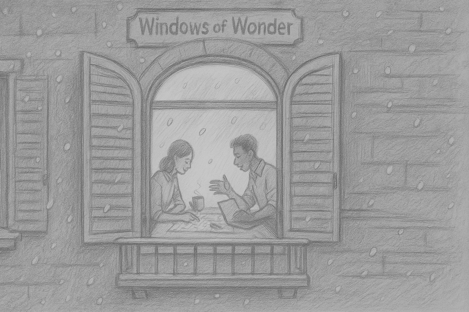 POV exterior. Dos Heartists colaboran en una mesa (notas, portátil, taza humeante). Copos cruzan el primer plano.