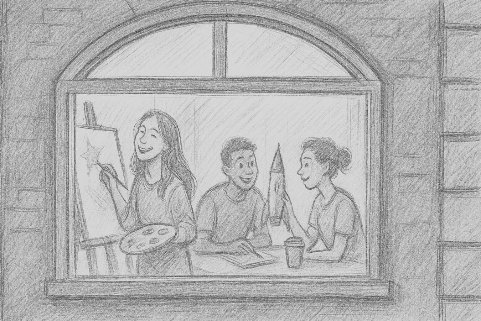 POV exterior. Una Heartist pinta una estrella; dos compañeros comentan un modelo. Luz cálida.