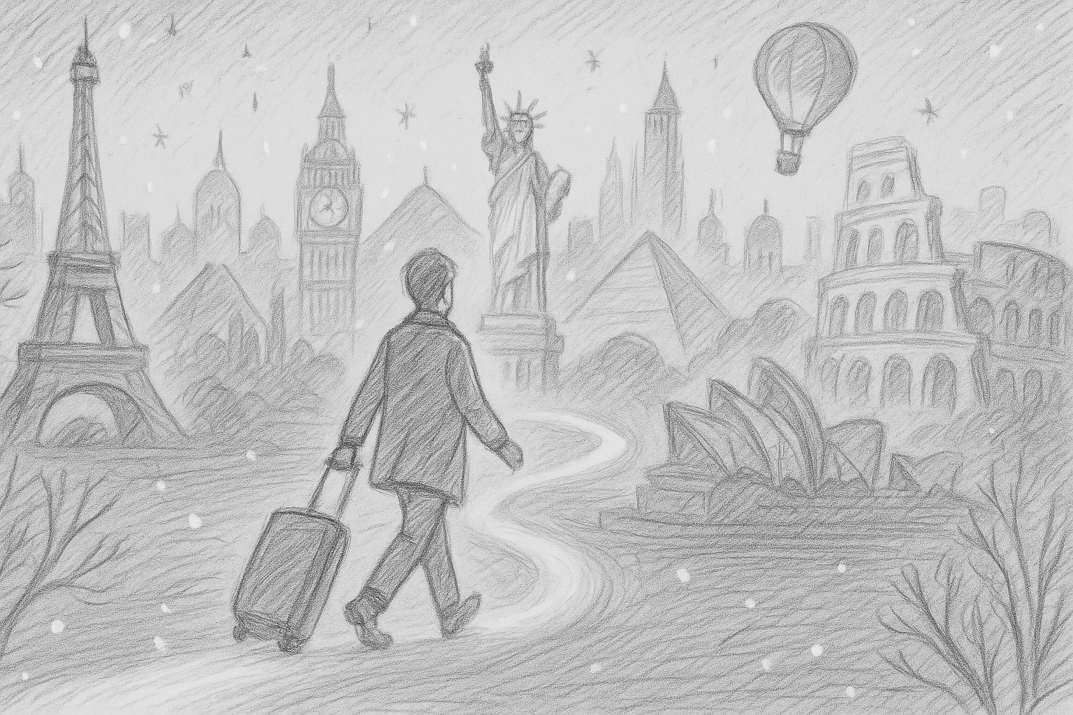 Viajero con mochila y trolley avanza por un camino brillante entre íconos (Eiffel, Big Ben, Estatua de la Libertad, Pirámides, Coliseo, Ópera de Sídney, globo).