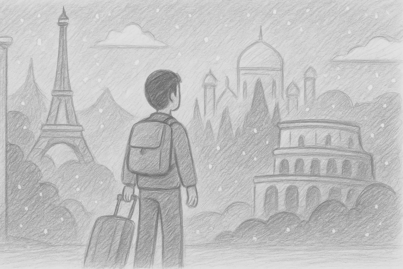 Plano medio/espalda del viajero mirando un paisaje de símbolos (Eiffel, cúpulas, Coliseo) bajo nieve.