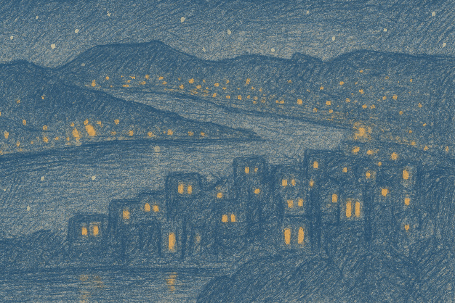Vista nocturna de bahía con colinas y poblaciones las ventanas se van encendiendo una a una.