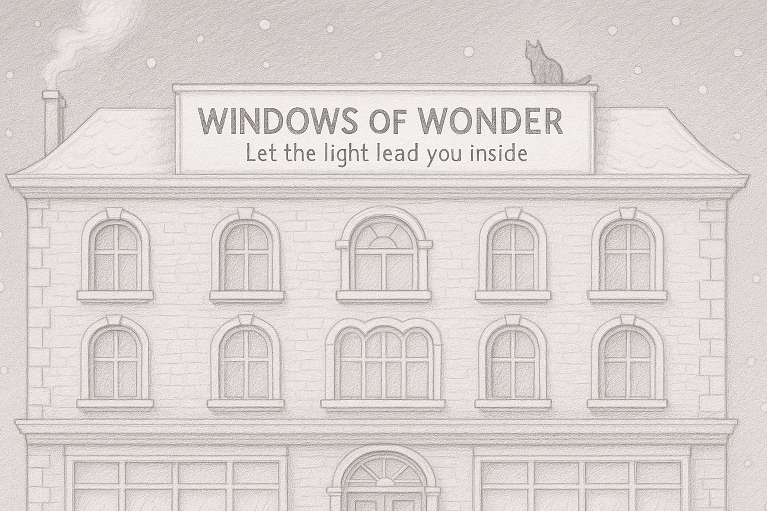 Fachada del hotel; rótulo WINDOWS OF WONDER con tagline. Un gato posa en el borde del tejado; chimenea con humo.