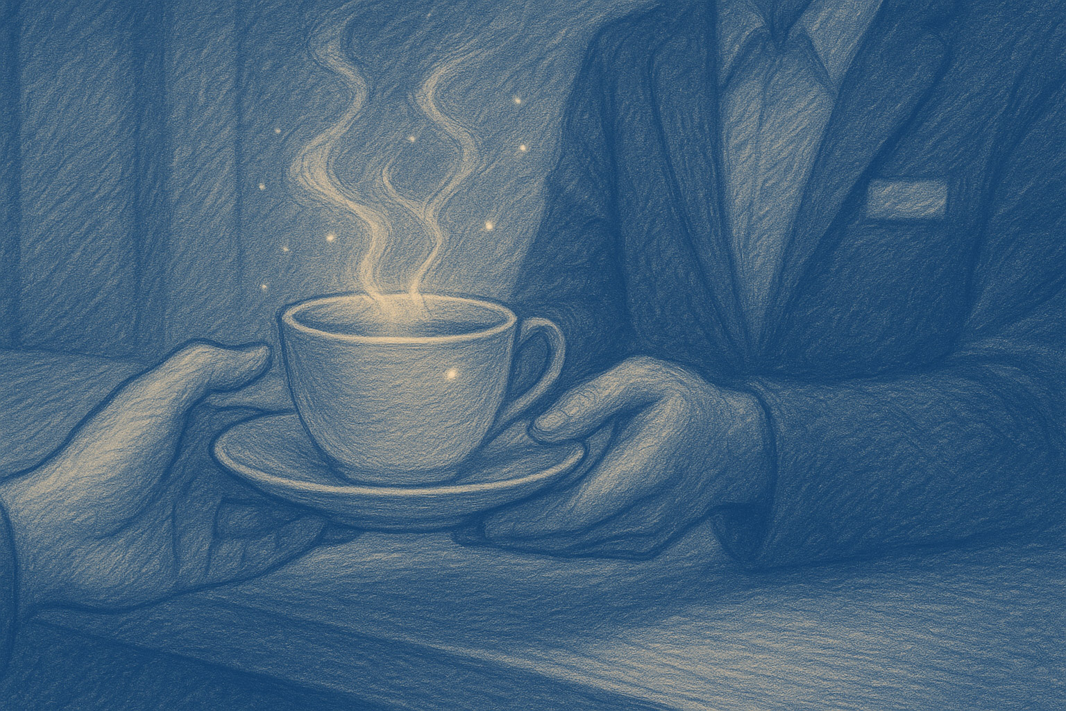 Gestos mínimos; vapor de la taza; leve acercamiento de cámara.