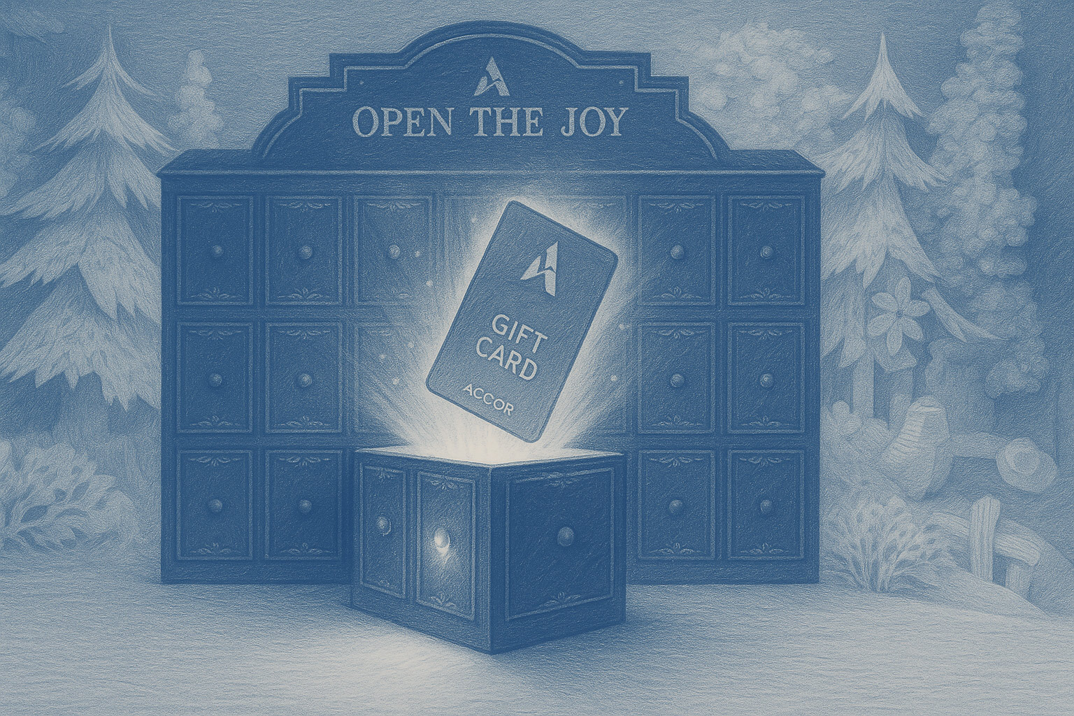 La propuesta vive en dos ejecuciones complementarias: azul Accor (clásico y premium) y blanco luminoso (festivo y minimal). Ambas respetan la paleta de marca con un acento dorado sobrio, combinan tipografía editorial y ornamentos discretos, y sitúan la “caja” en un entorno invernal no figurativo. El contraste frío–cálido guía la mirada hacia cada revelación y sutiles efectos de iluminación y partículas con glow aportan encanto sin ruido.