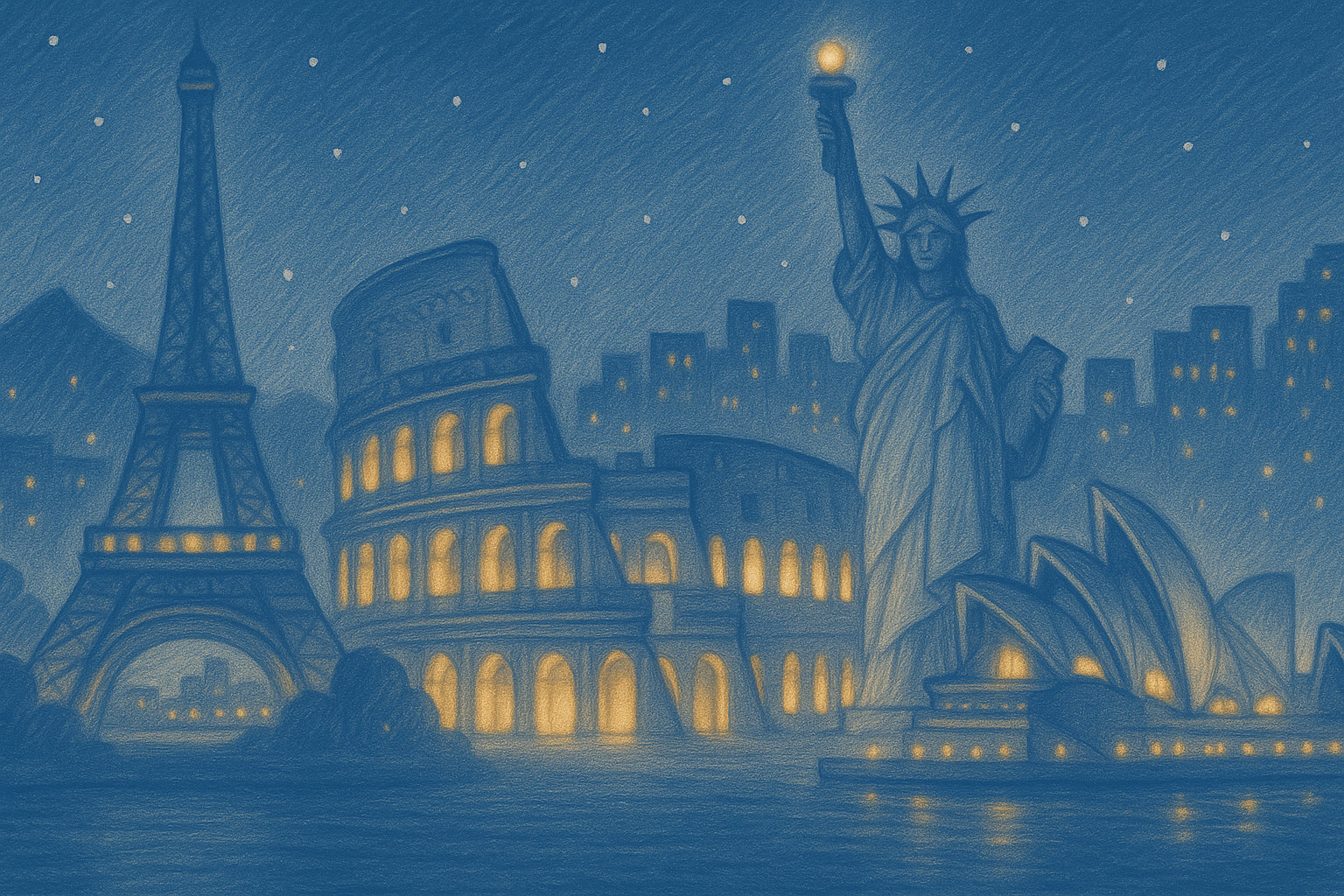 3–4 postales: París / Roma / NYC / Sídney (o equivalentes). Tratamiento homogéneo (frío suave + highlights cálidos).
